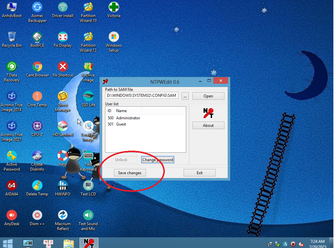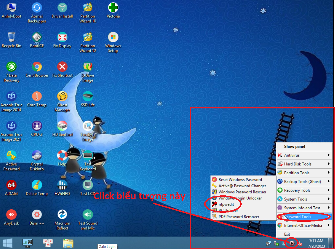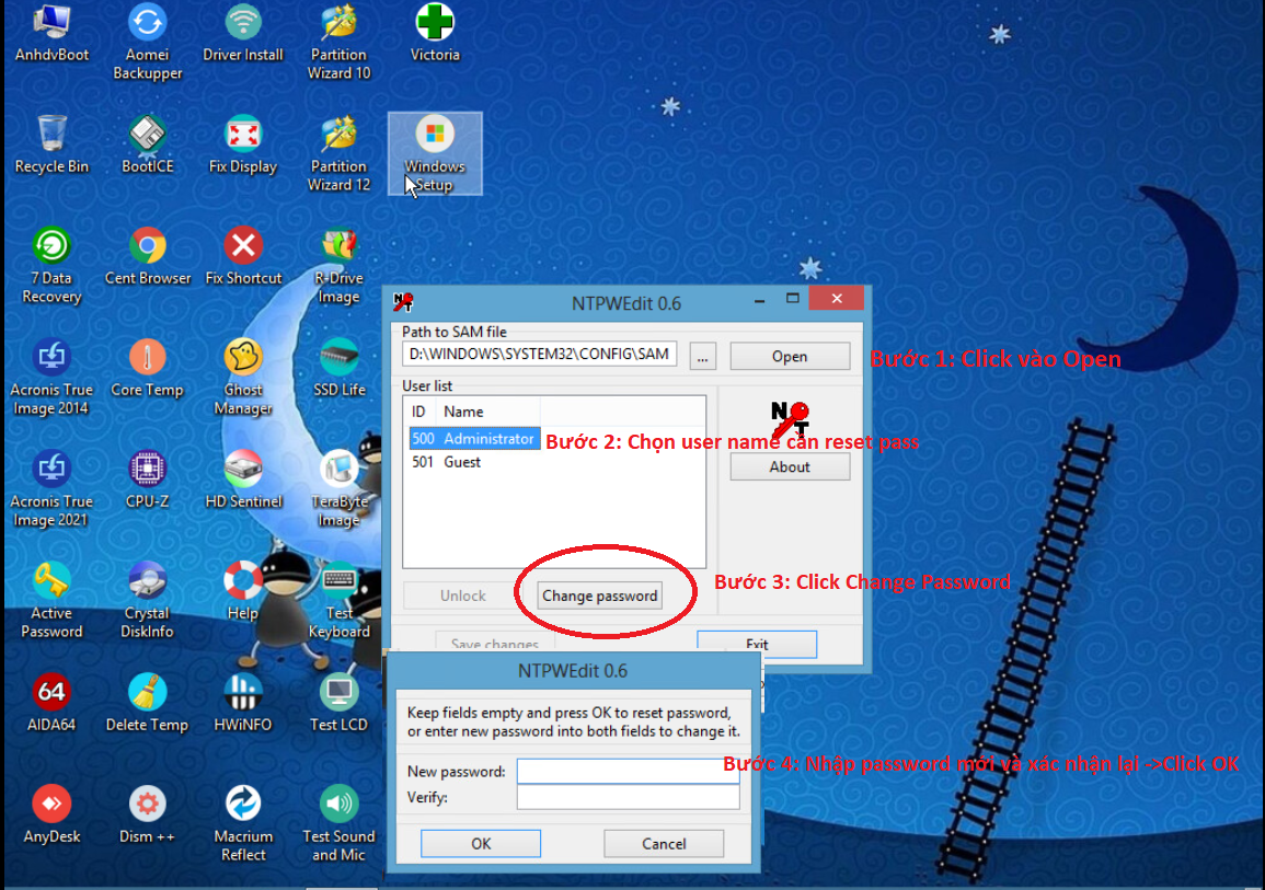 Bước 3. Sau khi truy cập vào WinPE, các bạn tìm phần mềm có tên NTPWedit 0.6 (Có nhiều phần mềm đi kèm chức năng tương tự các bạn có thể tự tìm hiểu, ở đây mình hướng dẫn bằng NTPWedit 0.6)